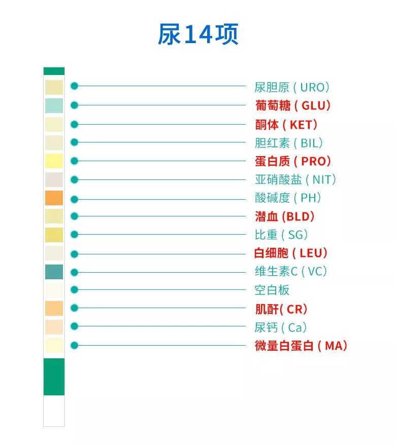 尿14项包括:微量白蛋白、肌酐、尿钙、蛋白质、白细胞、潜血/隐血、葡萄糖、酮体、尿胆原、比重、胆红素、酸碱度、维生素C、亚硝酸盐
